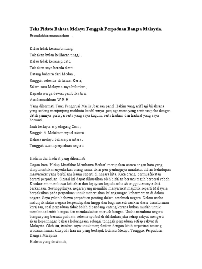 Teks Pidato Bahasa Melayu Tonggak Perpaduan Bangsa Pdf